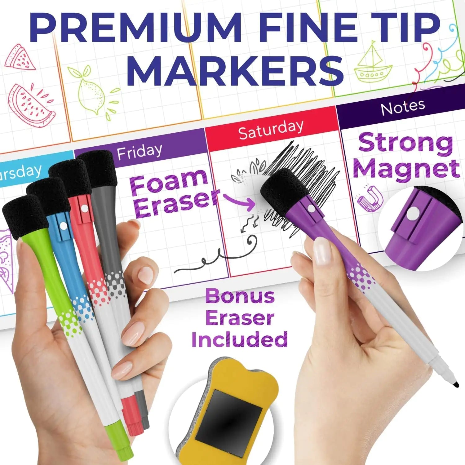 The set also comes with 5 whiteboard markers and an eraser that can be attached onto the boards. Notes can be easily wiped with the eraser or a clean piece of cloth, making the planners an eco-conscious alternative to paper calendars.