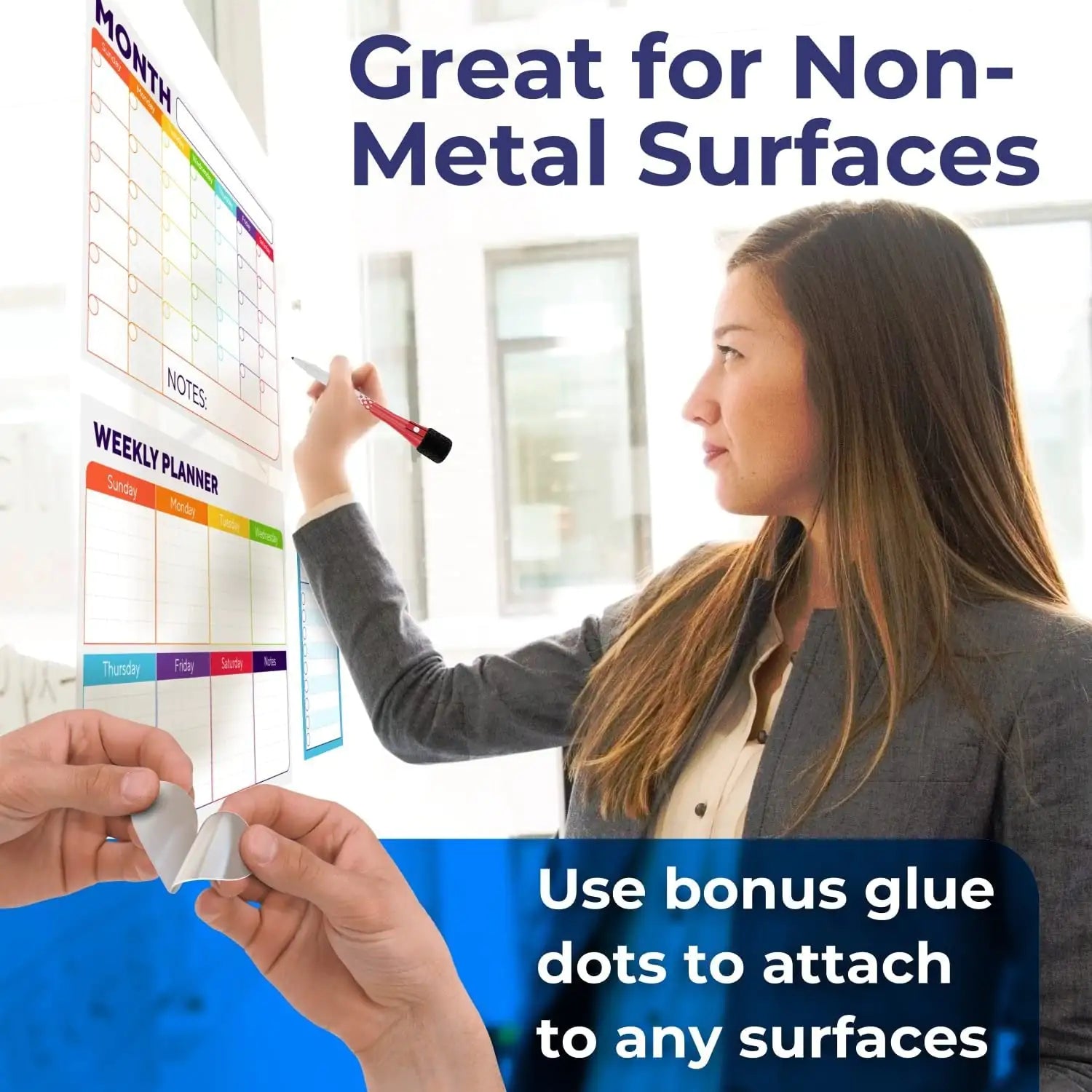 Each rectangular planner in this set contains three layers: a stain-resilient PET film, a printed surface, and a thick magnetic rubber bottom sheet. The boards can be firmly attached to any magnetic surface without using adhesives. If you want to put these planners on a non-magnetic surface, you can use the glue dots instead.